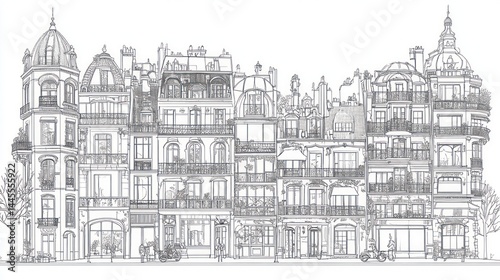 European city streets lined with ornate buildings. Detailed architectural drawings of many houses, balconies, and rooftops