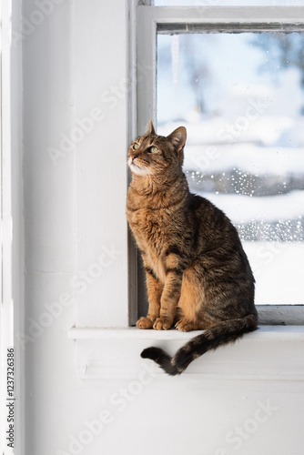 European common cat, grey, standing or sitting on a soft-bottomed window with a cloudy moon,