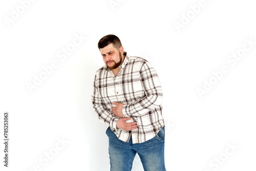 european fat young man emotions of pain on white background