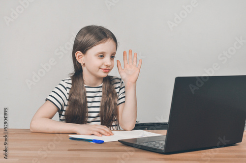 European girl with a laptop. Sitting at the table doing homework. Online learning