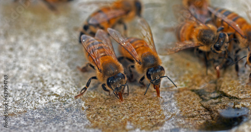 European Honey Bee, apis mellifera, Bees drinking Water on a Stone, Normandy