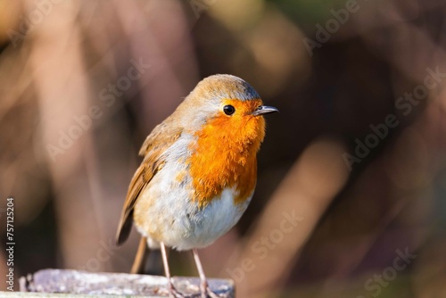 European robin perching on tree branch and singing.Small, cute and colourful bird in british woodland.