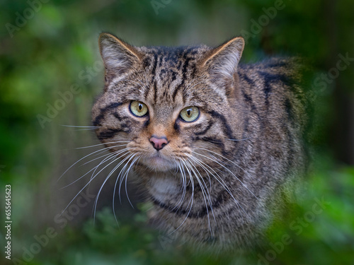 European wildcat (Felis silvestris silvestris) portrait, captive.Green foliage digitally added