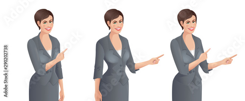 European woman wearing suit points to something. Smiling cute young women with pointer and demonstrating gesture. Vector illustration isolated on the white background.