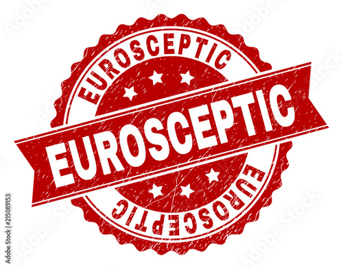 EUROSCEPTIC seal print with distress texture. Rubber seal imitation has circle medallion shape and contains ribbon. Red vector rubber print of EUROSCEPTIC label with corroded texture.