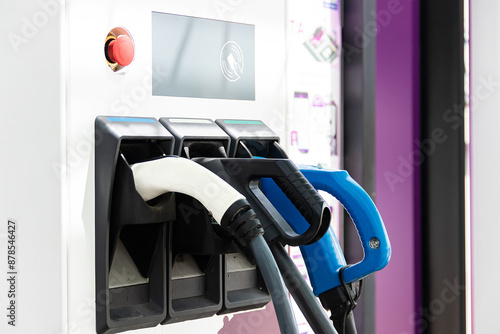EV station for charging an electric car. Socket for electric car battery charger. Clean energy and green eco concept.