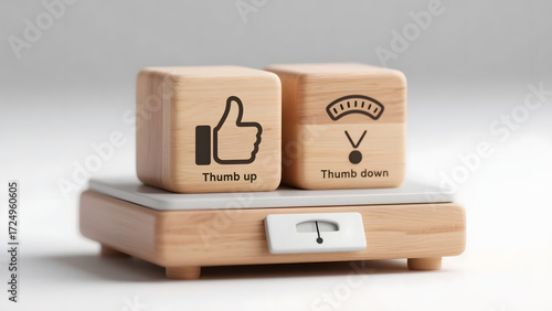 Evaluating Concepts Thumb Up and Thumb Down Blocks Balanced on a Scale, Symbolizing Assessment