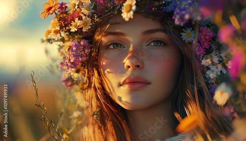 Evening Bliss with Girl Adorned in Flower Crown Watching Sunset