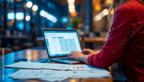 Evening cafe workspace setup with a wooden table, open laptop, stack of printed papers