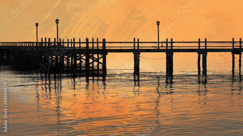 Evening calm at a serene pier with a golden sky and reflections on the water