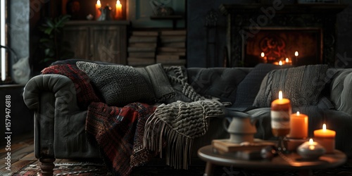Evening comfort, chunky knit blanket on sofa with candles. Soft golden lighting enhances hygge mood. A burning fireplace. New Year, Christmas, Christmas Eve