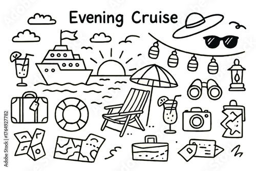 Evening Cruise Doodle. Evening Cruise. Hand-drawn doodle illustration Evening Cruise cruise ship, sunset, waves, cocktail, deck chair, flag, hat, sunglasses,