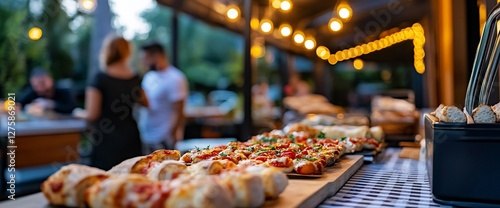 Evening Gathering with Delicious Pizza and Bread Under Festive Lights