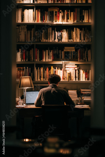 Evening in a study room with books on shelves A person uses a speech to text tool to write a report