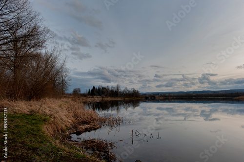 Evening over the lake, view of dark clouds moving with heavy rain.