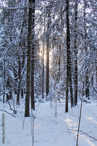 Evening sun in the snowy winter northern forest.