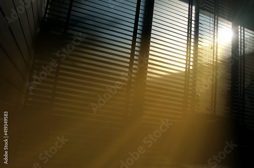 Evening sun light outside wooden window blinds, sunshine and shadow on window blinds , decorative interior home concept