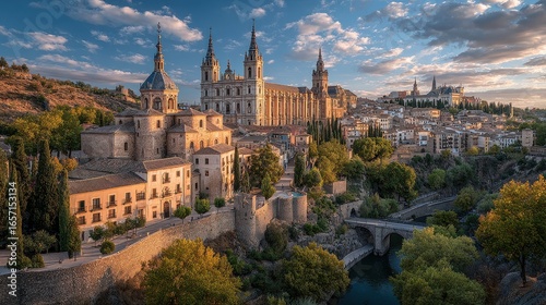 Evening view of Toledo cityscape with river Tagus and architectural reflection