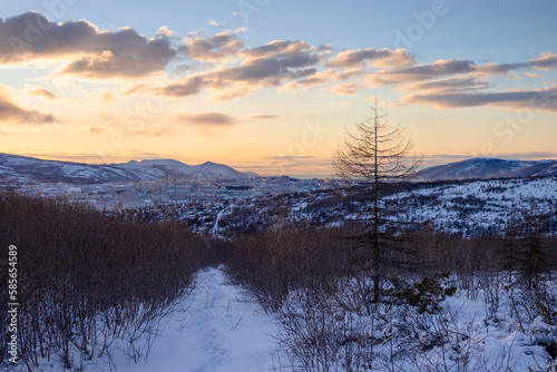 Evening winter landscape. View of the hills at sunset. Footprints in the snow. City in the distance. Beautiful nature of Siberia. Surroundings of the city of Magadan, Magadan region, Russian Far East.