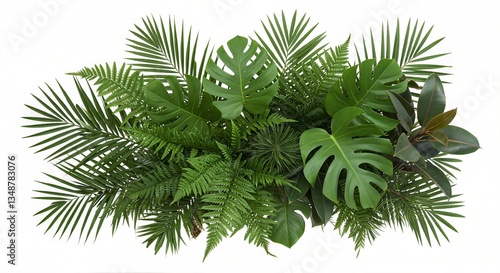 evergreen leaves of tropical plants shrubs (Monstera, palm, fern, rubber plant, pine, birds nest fern) floral arrangement isolated on white background . cutout, or clipping path.