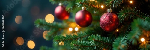 Evergreen tree with sparkling ornaments amidst blurred shimmering lights, winter wonderland,