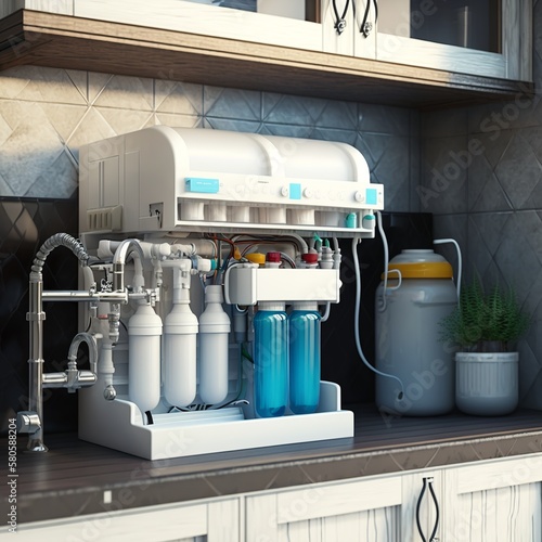everse osmosis water purification system under sink in a kitchen. Water cleaning system installation machine high tech solution filter bootle Generative AI
