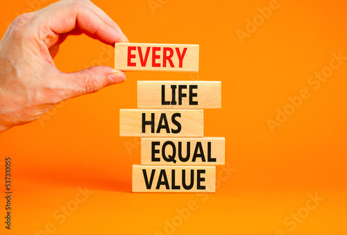 Every life has equal value symbol. Concept words Every life has equal value on wooden blocks. Businessman hand. Beautiful orange background. Business and every life has equal value concept. Copy space