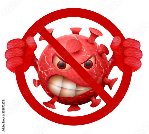Evil Covid-19 novel 2019-nCov Coronavirus Emoticon. Coronavirus Outbreak Concept. Bacterium inside the Prohibited Sign. Isolated on white background.