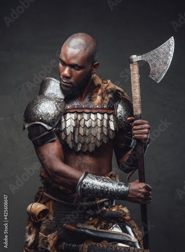 Evil manly warrior wearing royal antique armor and wielding an axe