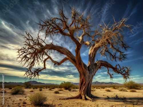 Evocative image the harsh beauty of a solitary dried tree desert landscape Generative Ai