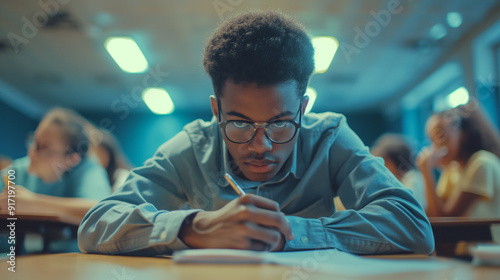 Exam Time: Students focused on taking exams in a classroom setting, with copy space for exam tips or encouragement