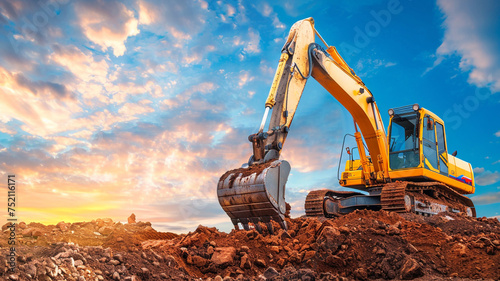 Excavator at a construction site at work against the sky background