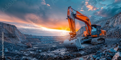 Excavator at sunset in a quarry. Heavy equipment and construction site