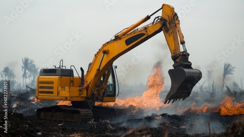 Excavator battling flames in deforested area at dusk, showcasing environmental crisis and heavy machinery in action