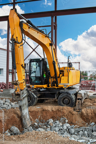 Excavator digging a trench at a construction site under a clear blue sky