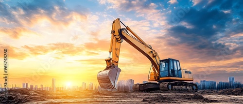 Excavator Digging at Sunset with City Skyline in Background