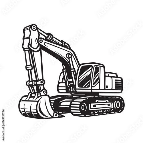 Excavator Machine Icon, Heavy Equipment Excavator, Construction Earthmoving Loader, Black and White Digger Illustration