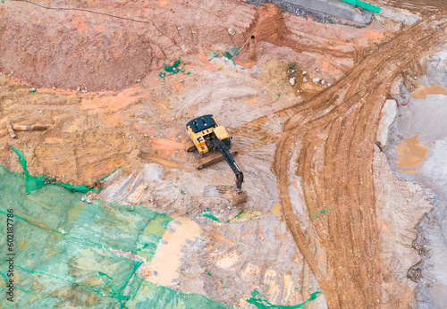 Excavator on earthmoving at construction site, aerial view.