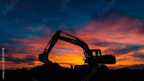 Excavator Silhouette Against a Dramatic Sunset Sky