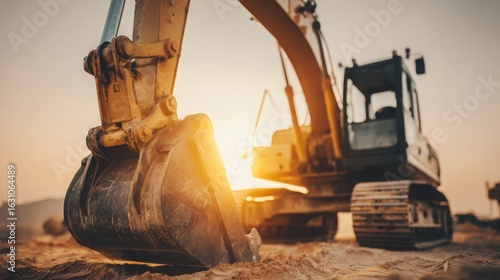 Excavator silhouette against vibrant sunset sky, construction site softly blurred in background.