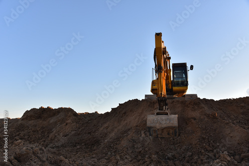Excavator working at construction site. Backhoe digs ground in sand quarry on blue sky background. Construction machinery for excavation, loading, lifting and hauling of cargo on job sites