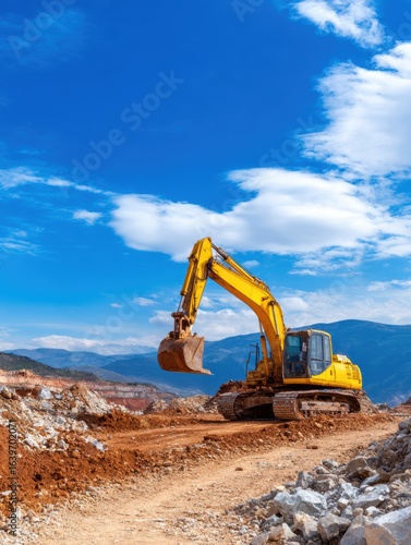 Excavator working on a construction site under a clear blue sky with mountains in the background