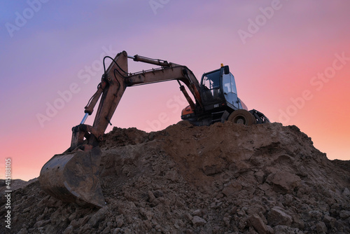 Excavator working on earthmoving at open pit mining on sunset background. Backhoe digs sand and gravel in quarry. Heavy construction equipment during excavation at construction site
