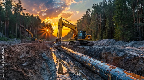 Excavators installing pipeline at sunset in a forest.