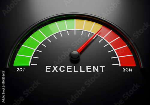 Excellent performance meter gauge with red needle reaching maximum level indicator showing success