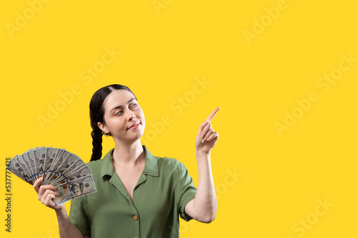 Exchange and stock market. Portrait of a smiling attractive Caucasian woman holding a fan of dollar currency and pointing with finger at a yellow background. Concept of shopping, income and banking