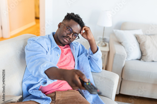 Excited African American Man Pointing Television Controller To Camera Switching Channels Watching TV . Television Programming Advertisement. Selective Focus