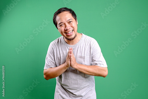 Excited Asian Man Showing With Welcome and Greeting Gesture or Begging About Something