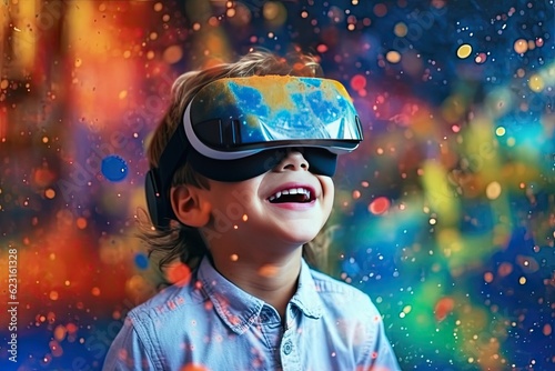 Excited child or kid wearing VR headset with a big smile on face, enjoying a virtual reality experience that sparks wonder and joy. Generative AI