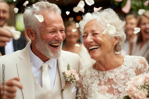 Excited couple celebrates their joyful wedding day surrounded by loved ones and flower petals in a beautiful outdoor setting